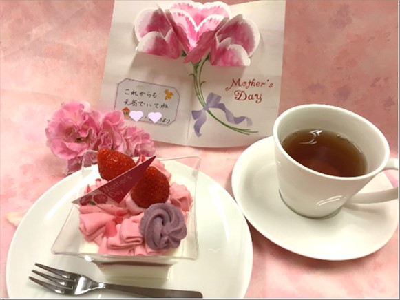 そして施設からは、母の日を楽しんで頂こうと、野菜たっぷり色鮮やかなランチと、目と舌で楽しめる素敵なケーキをご用意致しました。
