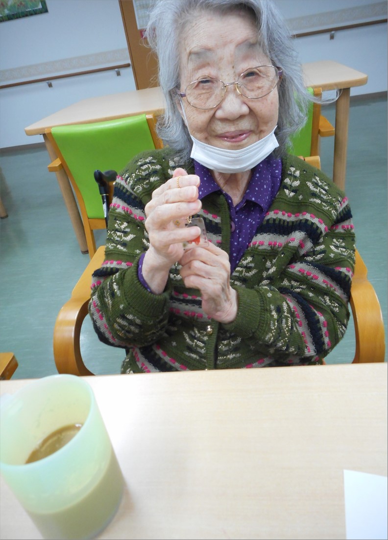 「これでいいのかしら…」と不安そうだったり、制作に乗り気でなかった方も完成したキーホルダーをご覧になると「あらきれい!」「いいじゃない!」と笑顔。