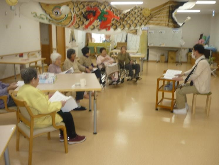 おなじみ施設長のギター演奏会!!皆さん一緒に手拍子されながら口ずさんでいました。