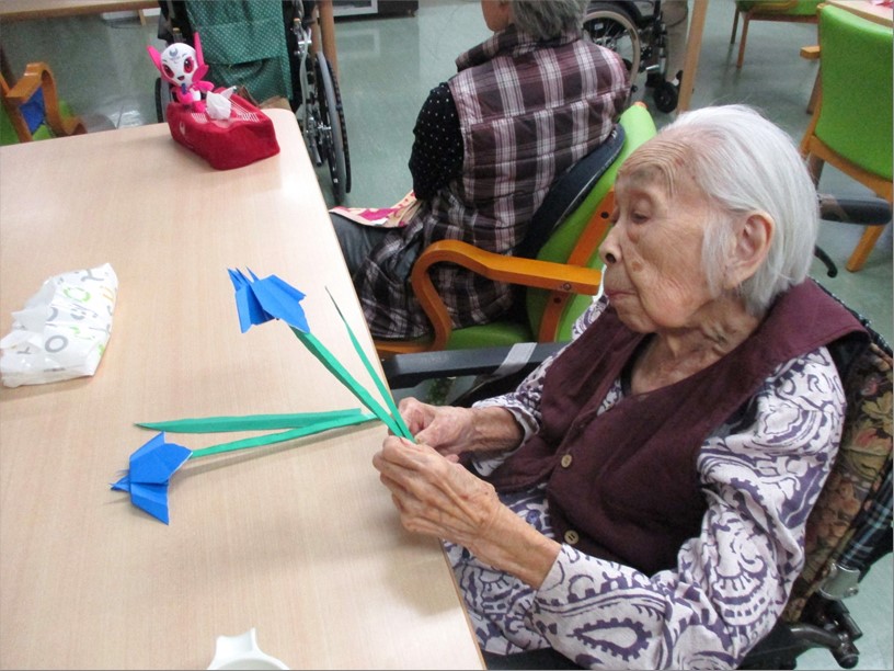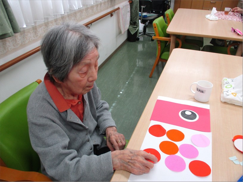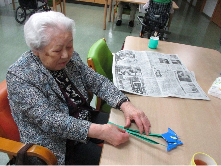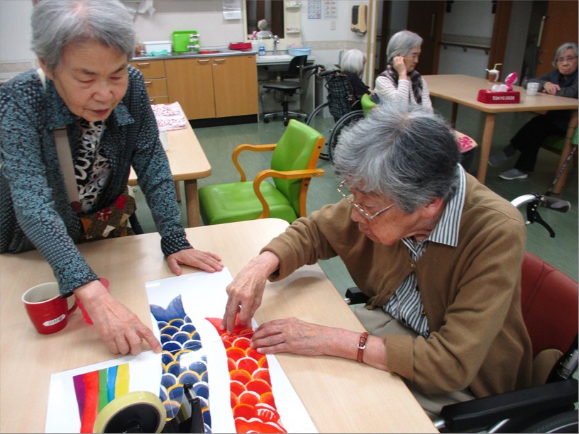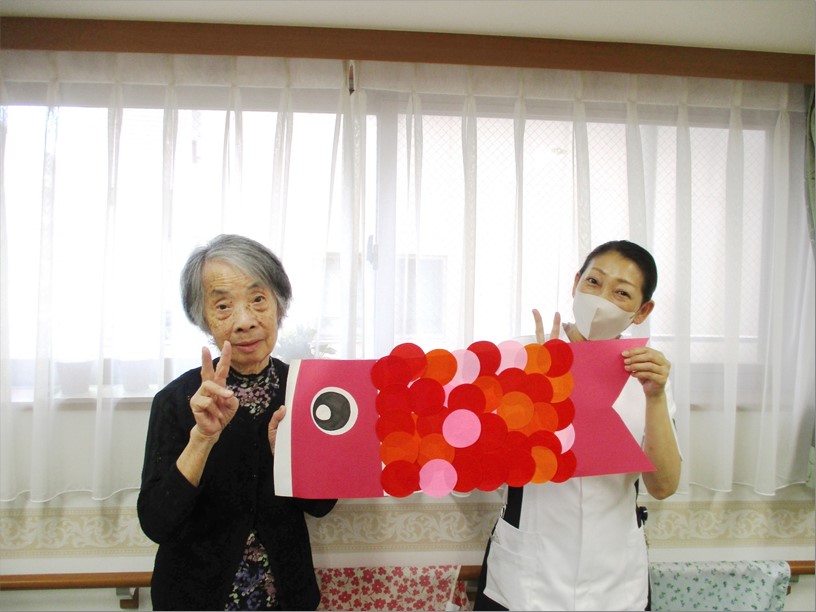 大きな鯉のぼりや花菖蒲を見て、男性陣から『5月5日は端午の節句、男の日だよ!』と声が上がり、女性陣から『あら、今はこどもの日っていうのよ?』と返されていたので、職員が『お祝い事は男女どちらでも嬉しいですよね。』と応じると、皆さま笑顔で頷かれ完成まで楽しく製作されました。