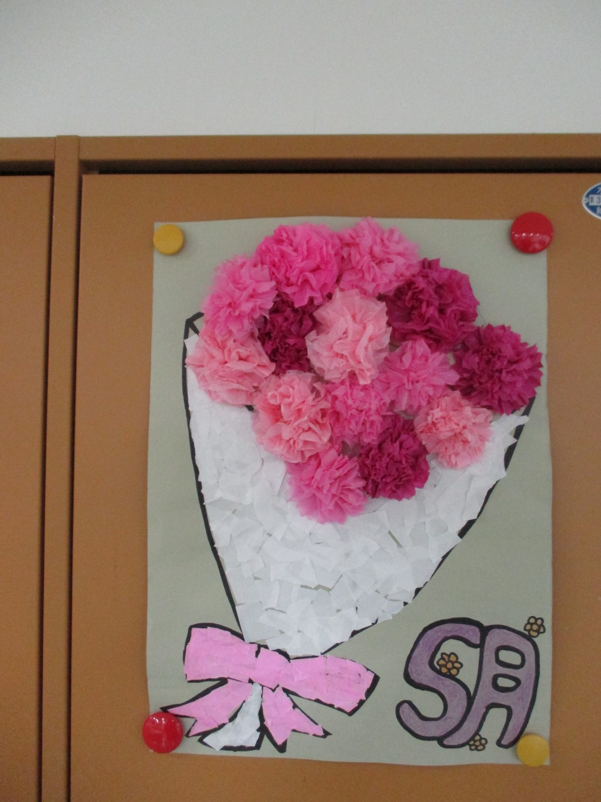 最後に、ご入居者様と職員で共同制作したカーネーションの花束です。全てのお母さんに『ありがとう!』