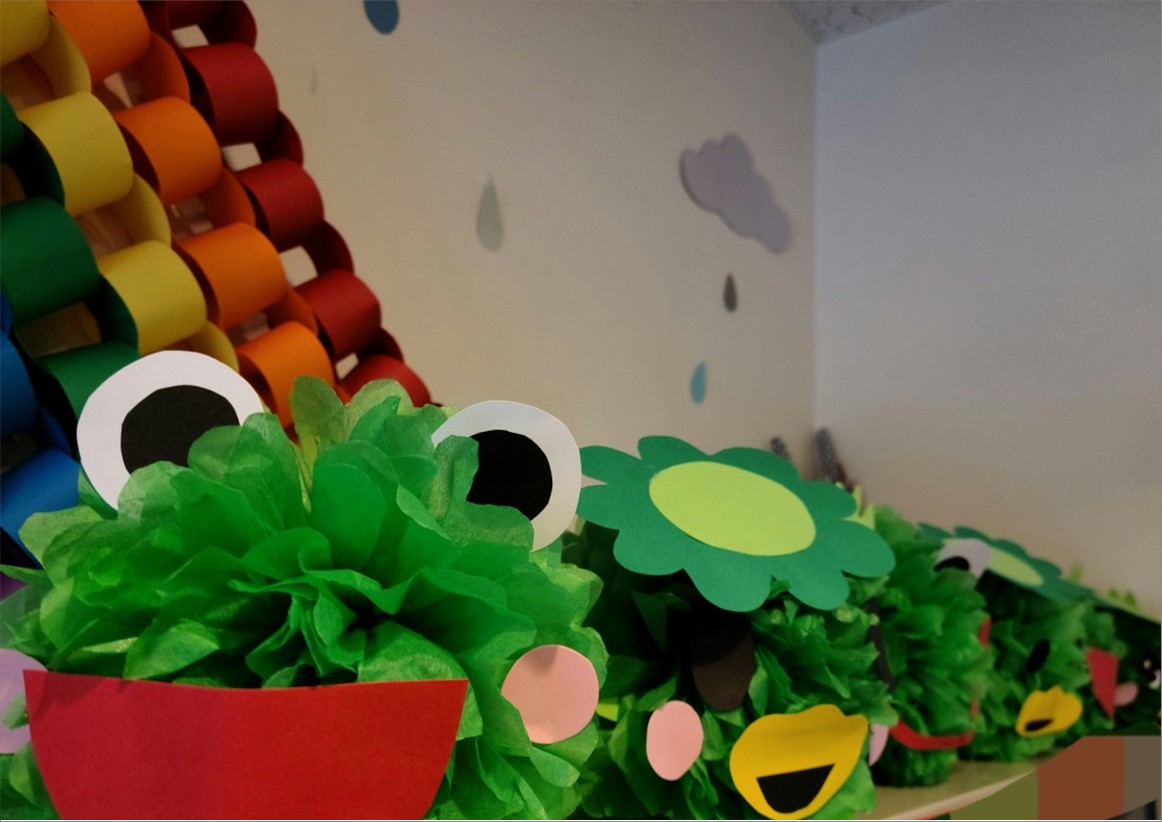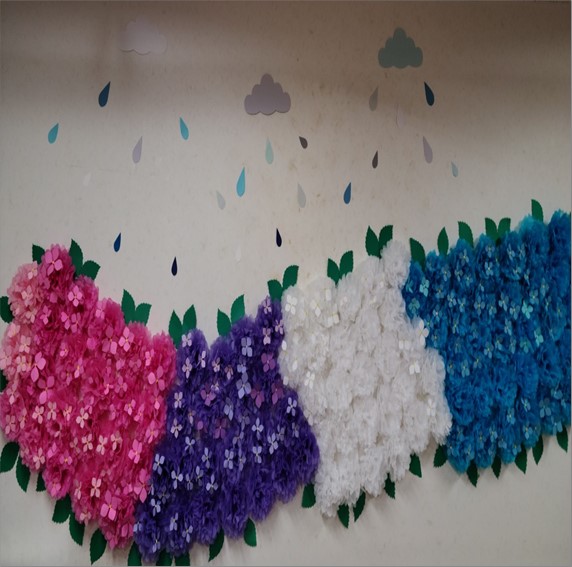 玄関前、天井には色とりどりの紫陽花、梅雨を表している傘や雫が飾られています。