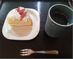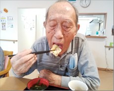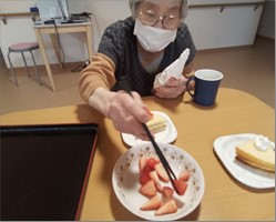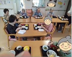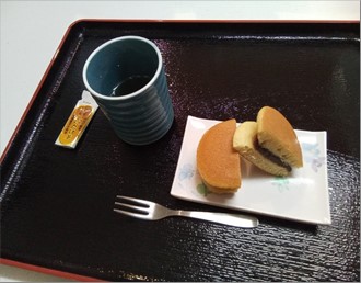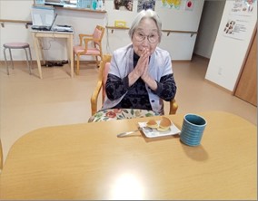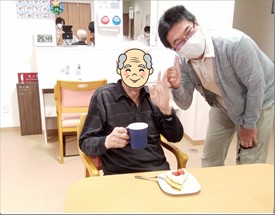 入居者さまのお誕生日会の写真です。珍しいしいたけ茶とどら焼きでお祝いです(#^.^#)