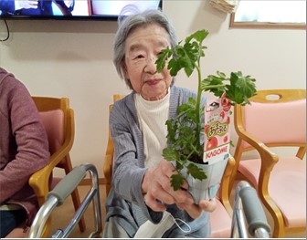 外も暖かくなってきました。日光浴をしたり、野菜の苗を植えている様子の写真です。大きく育ってね(^^)