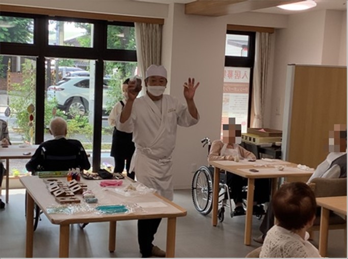 当施設のご近所にある人気和菓子老舗店「あわ家惣兵衛」の社長様とアシスタントのかたをお迎えし、作り方のご指導をいただきました。
