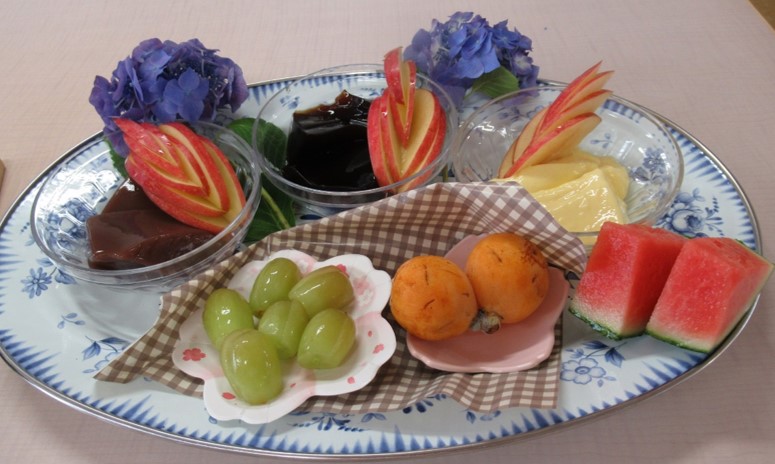 4階はプリン、ようかん、コーヒーゼリーの中から好きなものを選んで頂き果物をトッピングして召し上がって頂きました。