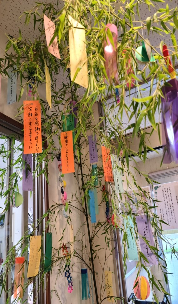 『リーシェ黒埼山田』では、笹を取りに行き(許可を頂いています。)、七夕飾りと皆様より書いていただいた短冊を飾りました。