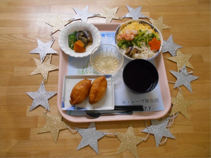 お昼には七夕メニューで七夕そうめん、いなり寿司、炊き合わせ、梅ゼリーで豪華に七夕を楽しみました。