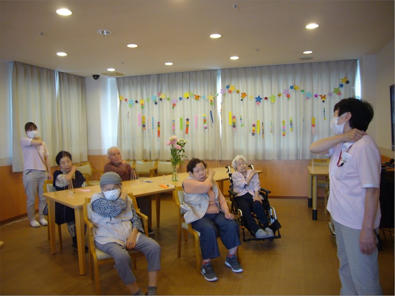 初めに軽く身体を動かしてから、皆で声を合わせて「たなばたのうた」を歌いました。