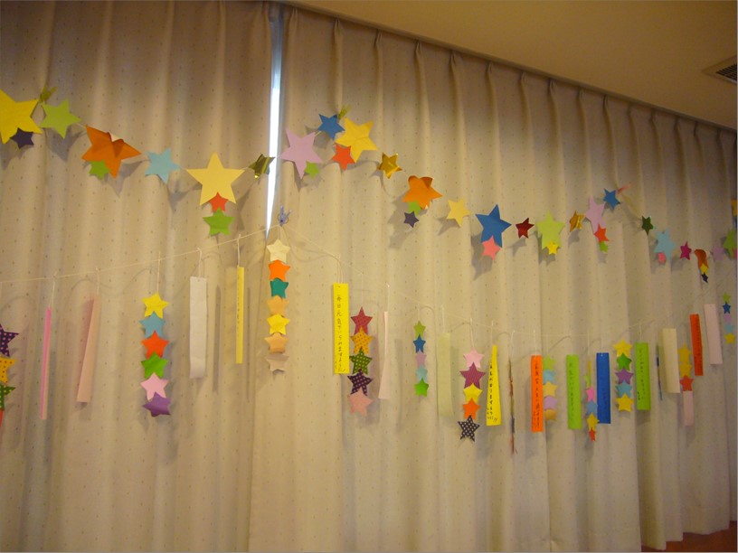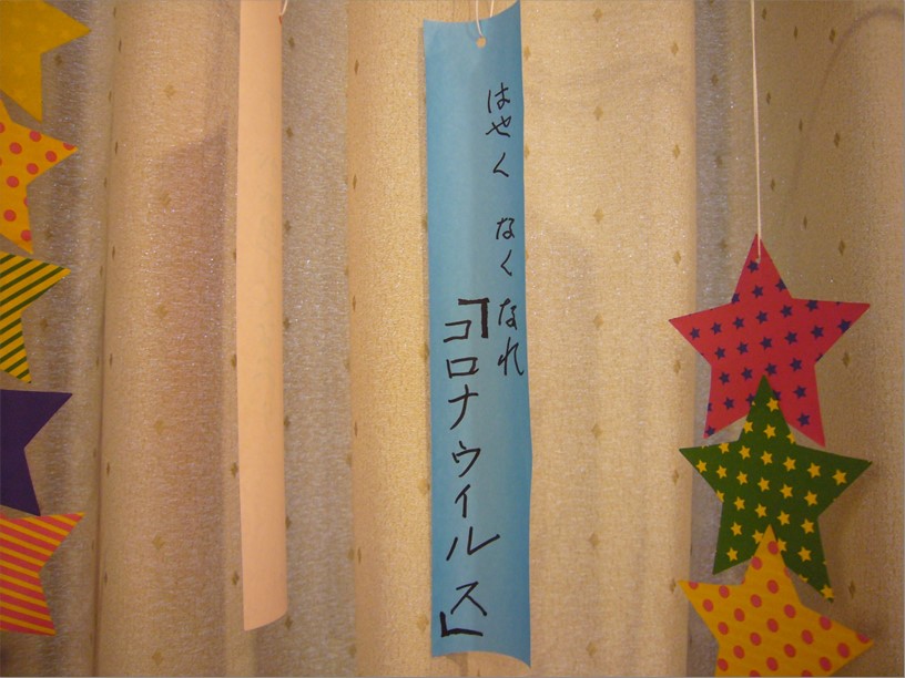 短冊は、5階ラウンジに飾らせていただきました。「はやくなくなれコロナウイルス」、全員の願いですね。