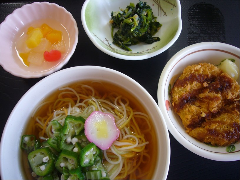 こちらは、7月7日の昼食、「七夕」お祝い献立です。七夕そうめん、南瓜コロッケ、ほうれん草のなめ茸和えなどです。ごちそうさまでした。