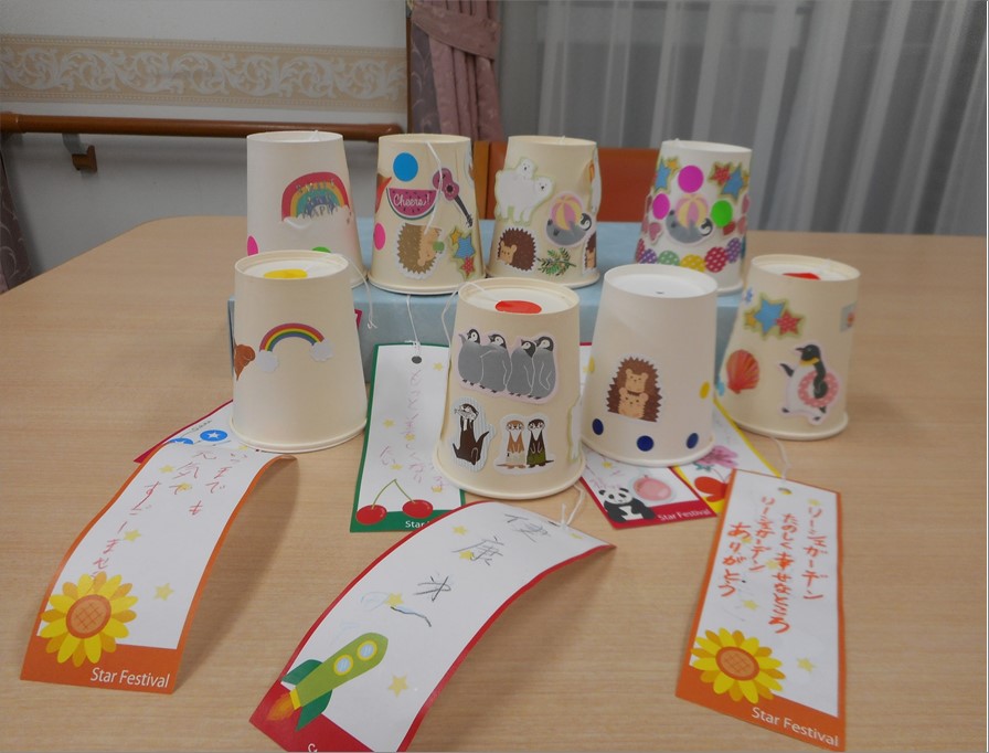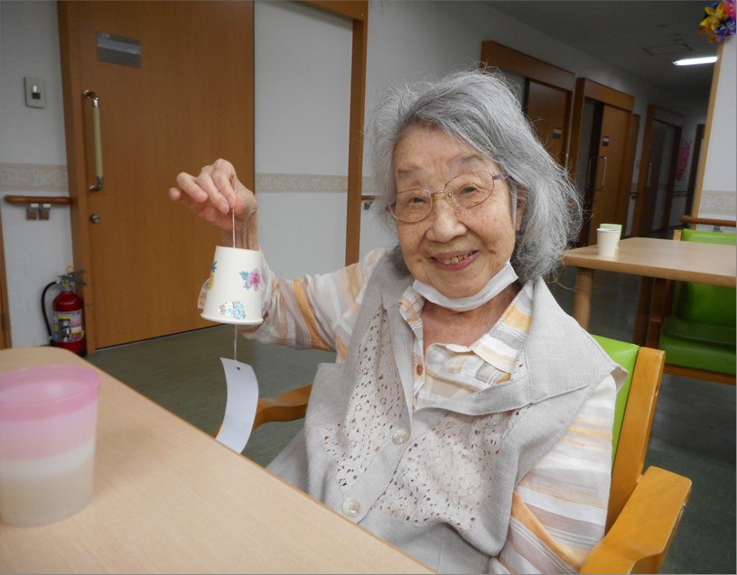 7月の一大イベントといえば…七夕です!短冊に願い事を書いて頂き、お星さまに届く様に…お手製風鈴につけて音色でもアピールしてみました!