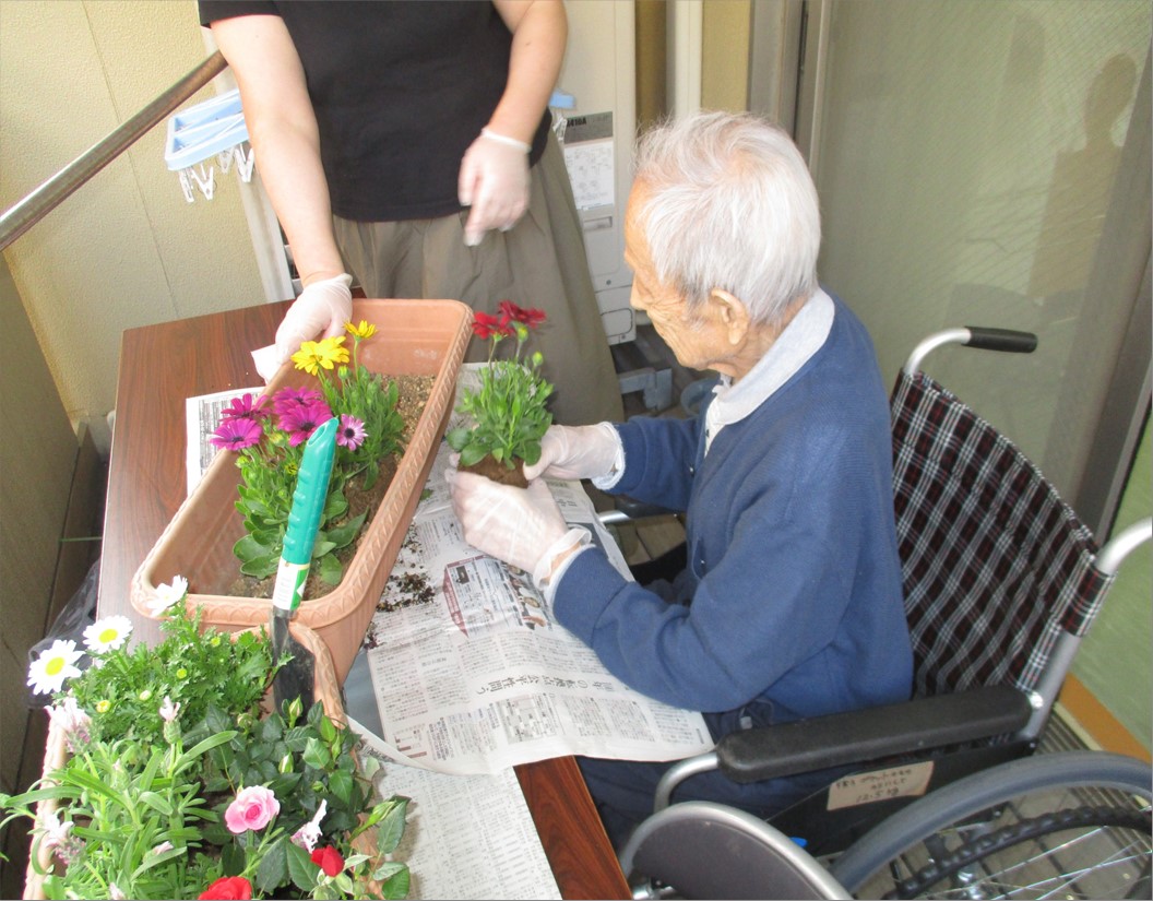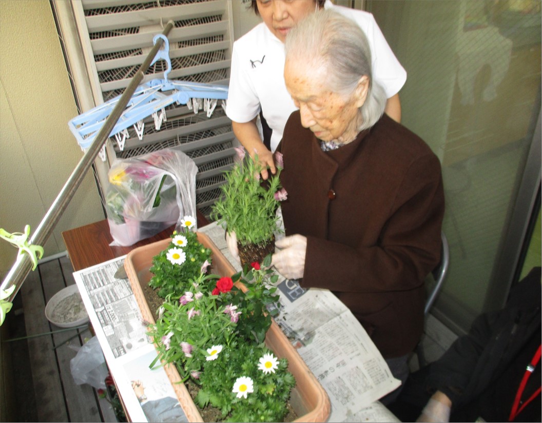 『リーシェガーデン和光(特定施設)』では、「STAY HOME(ステイホーム)週間」、ベランダでお花見を楽しもうと、寄せ植えを作りました。