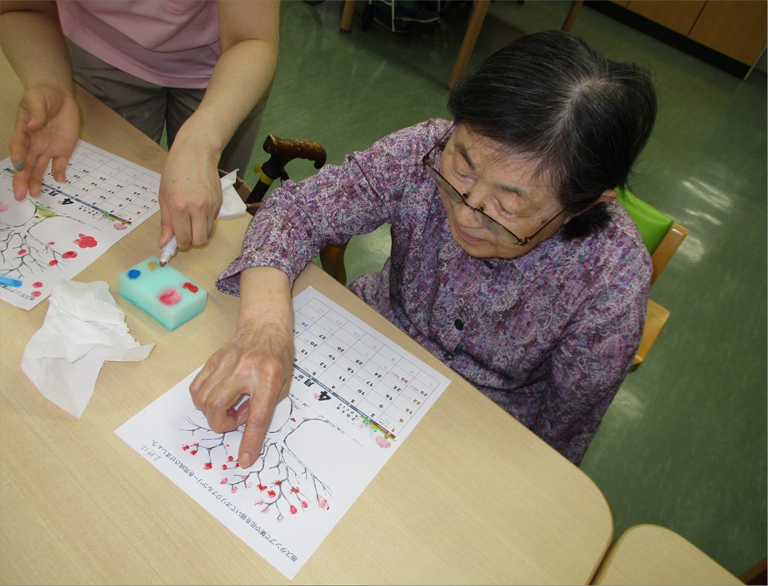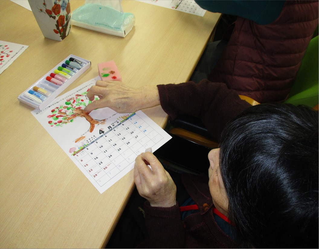 2.指紋ツリーカレンダー 指スタンプで葉や花を描いてオリジナルツリーを描きました。