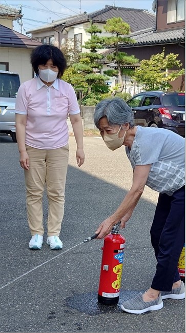 無事、皆様の避難が終わると、今度は水の入った消火器を使って消火訓練を行いました。