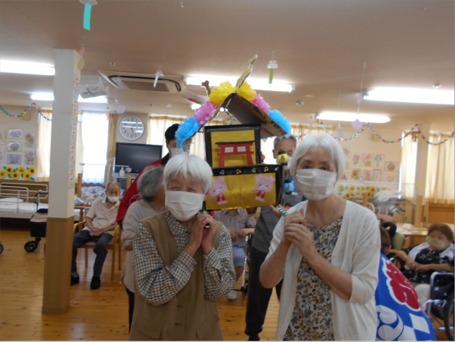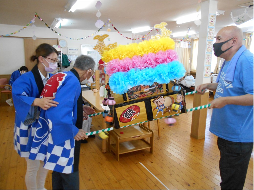 『デイサービスセンター松明』では夏祭りに向けて、ご利用者様と協力しながら御輿や屋台を手作りしました。