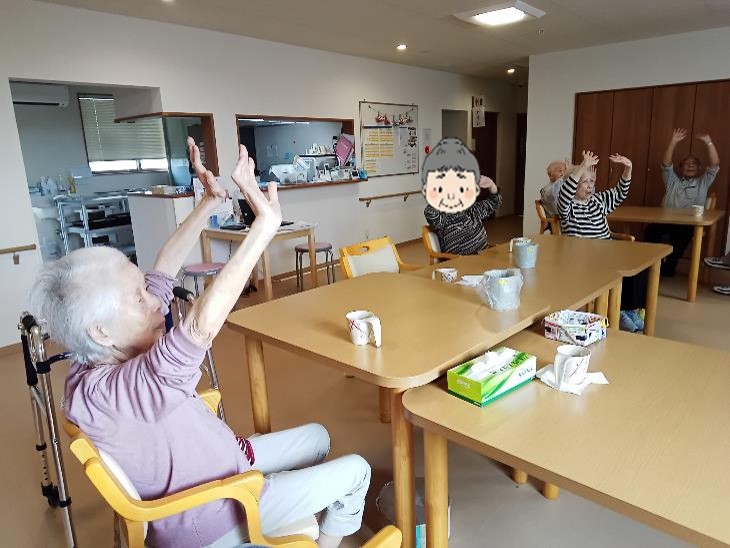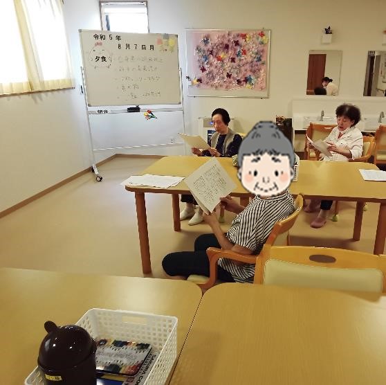 身体を動かした後は入居者様と職員一緒に大きな声でカラオケの歌を歌詞カードを見ながら合唱。
