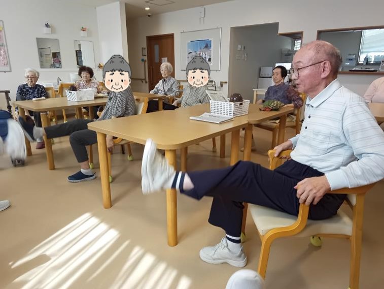 次に足上げの運動です。掛け声に合わせて足を右足、左足交互に上げていきます。