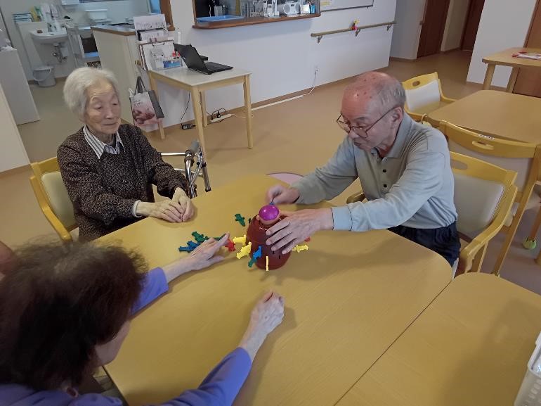 レクリエーションのゲーム黒ひげ危機一髪で勝負。黒ひげが飛び出さないよう慎重に選びながら剣を挿していきます。