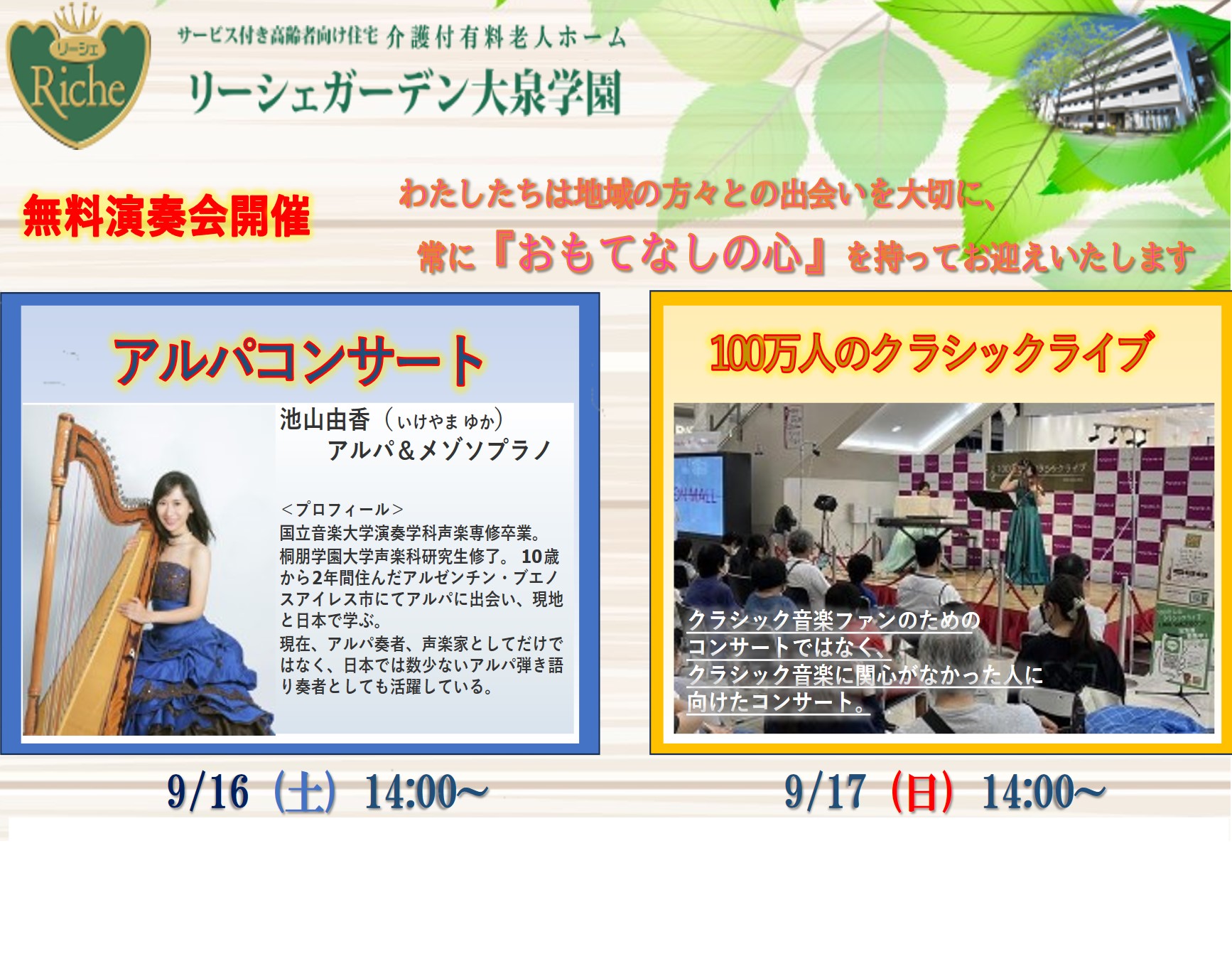 『リーシェガーデン大泉学園』では、来る9月16日(土)、17日(日)に久しぶりにコンサートを催すことに