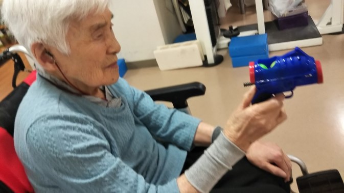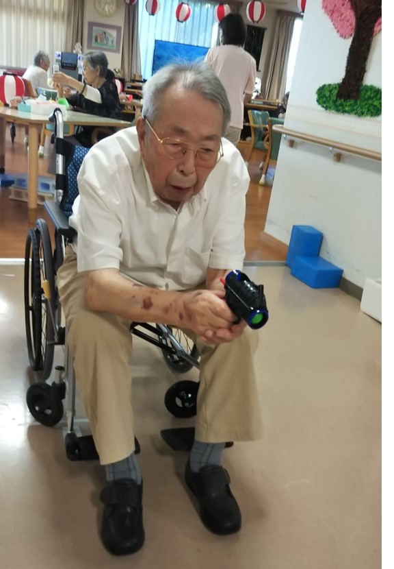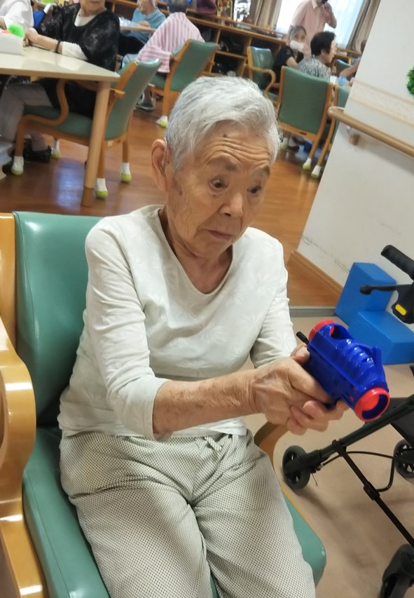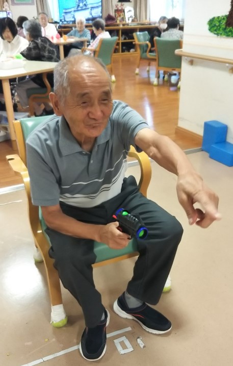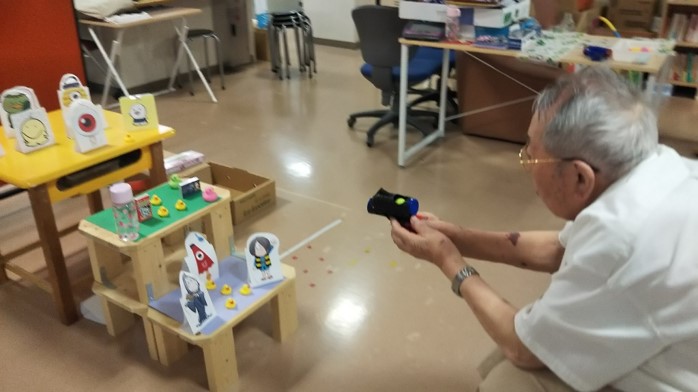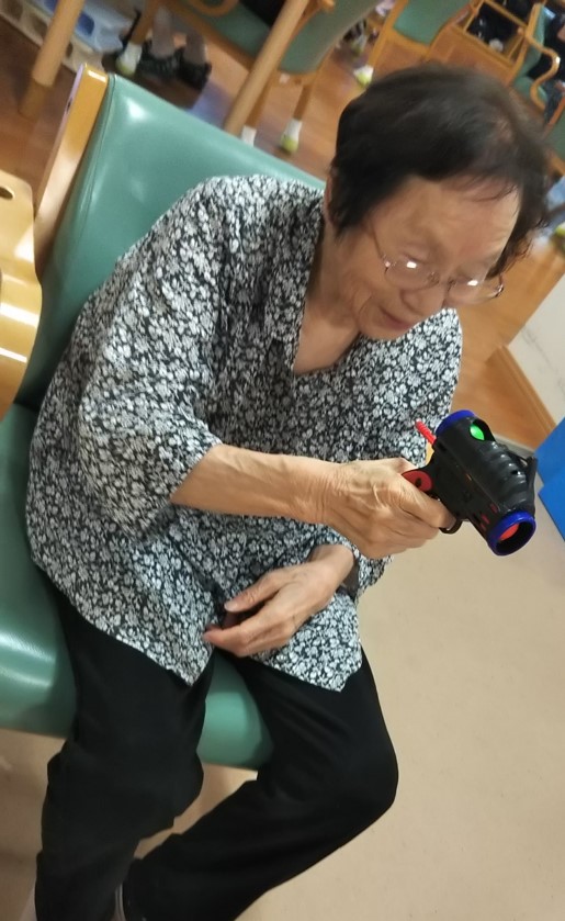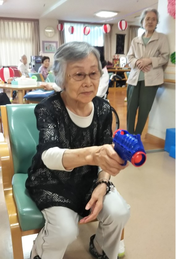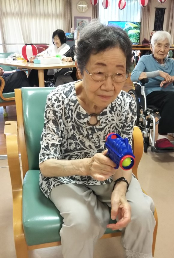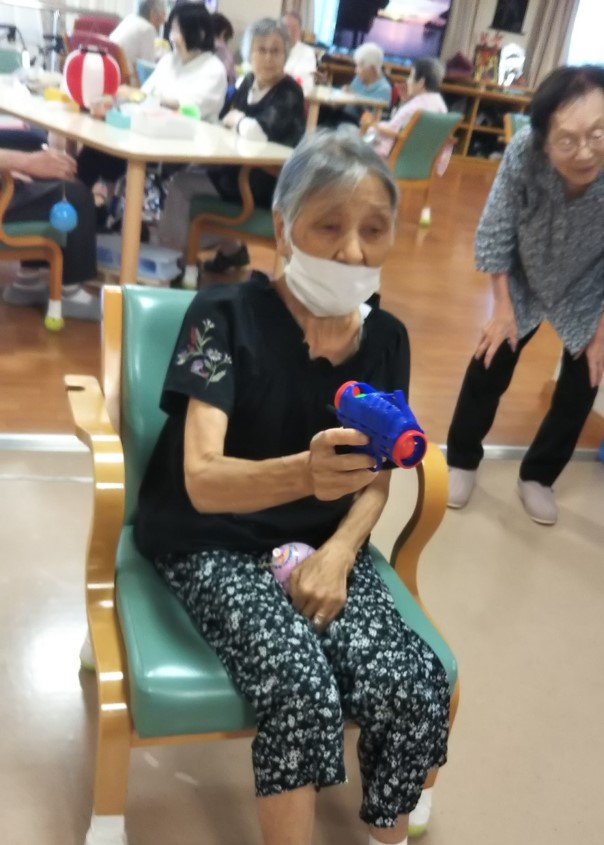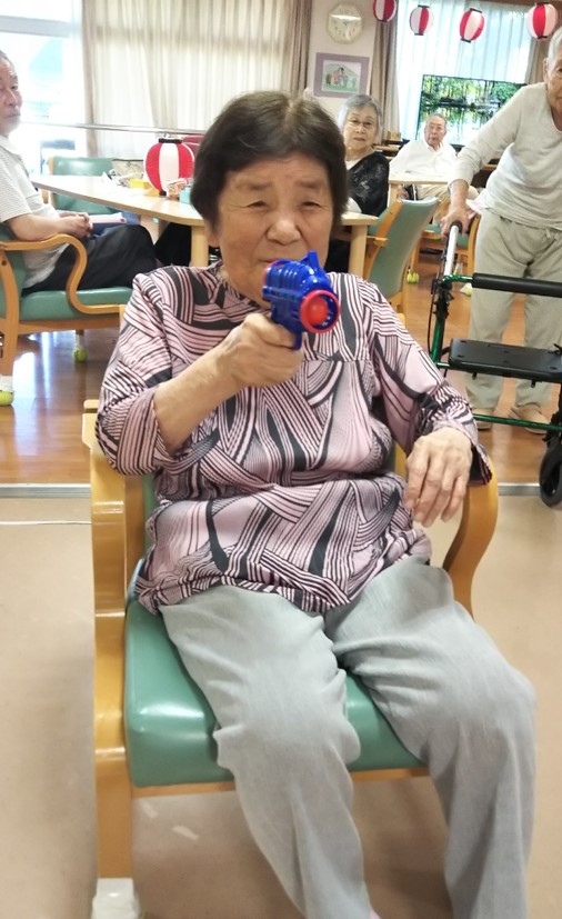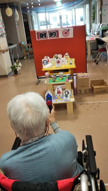 次は射的です。的を狙い、銃を構える表情は、機能訓練を行う時とは大違い、とにかく真剣な表情(;^ω^)