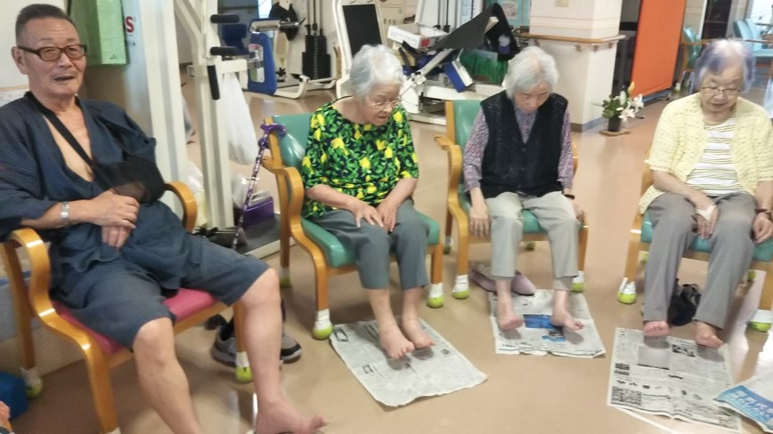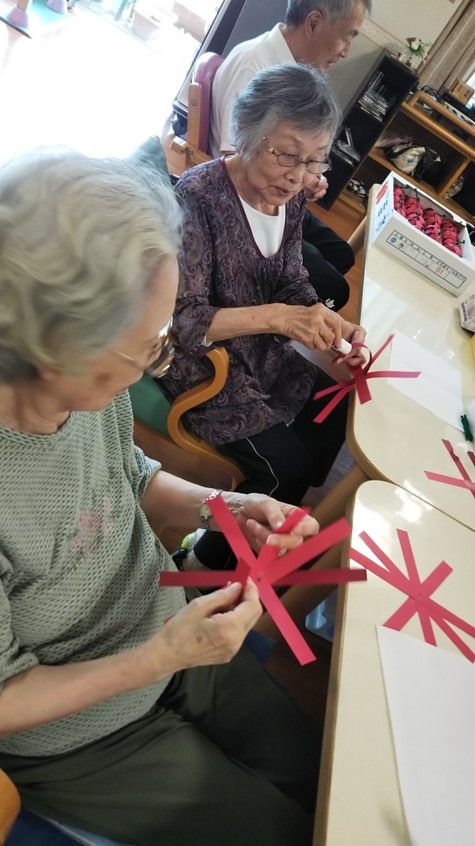 カレンダー作りなどの作業レク、足の指だけで新聞紙を小さくたたんでいく機能訓練的なレクリエーションなど、その時間は職員も一緒に楽しませて頂いております。
