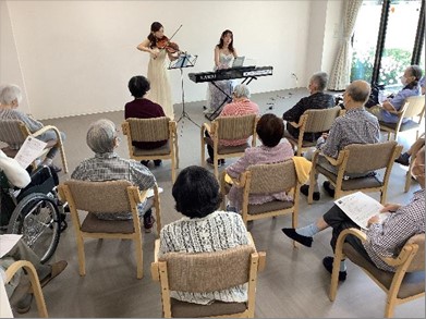 演奏会が2日間続いたことは初めてでしたが、ご入居者様たちは演奏者たちの力強く引き込まれるプログラム進行に魅了され、集中して音楽とトークを聴いていらっしゃいました。