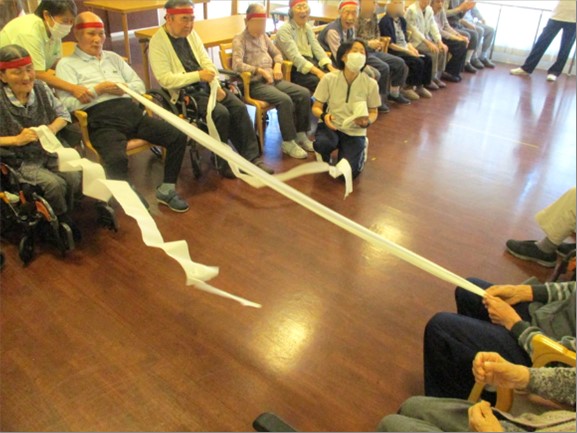 綱引き、といっても引くのはトイレットペーパーです。向かいの人と「いち、にの、さん!」で同時に引っ張り合って、ペーパーが長く残った方の勝ちです。