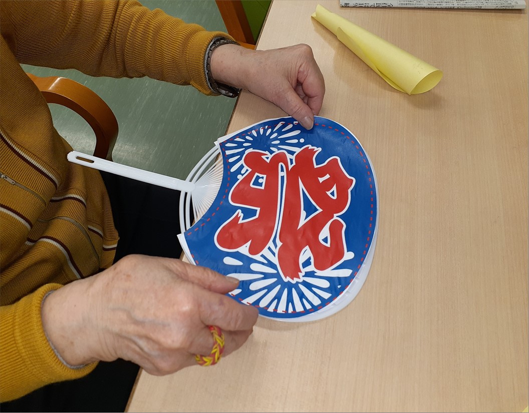 うちわ骨にご入居者様の好きな画像を貼り、オリジナルのうちわを作ります。