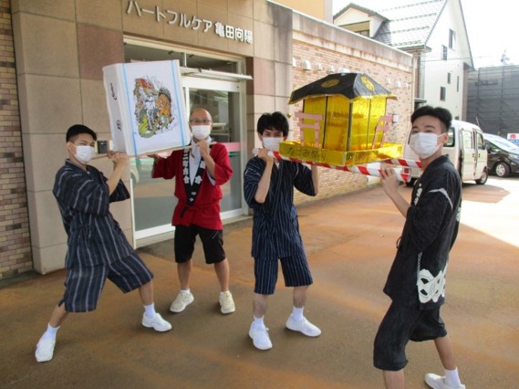 職員も甚平や浴衣、法被を着て準備万端!御神輿と御神灯を担いで、いざ開始です!!