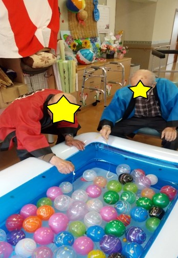 他にも、水風船釣りやビーチボールを使ってのボーリングを行いました。