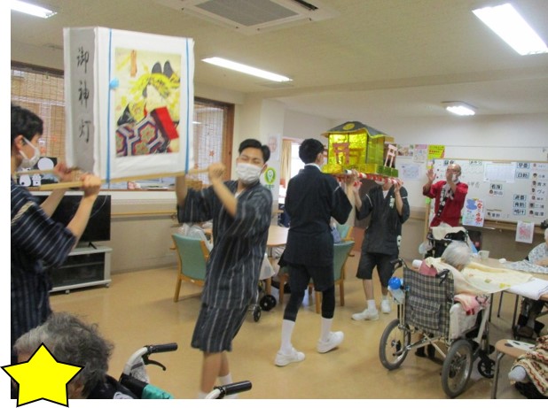 男性職員が御神輿と御神灯を担いで、各階をまわりフィナーレ。