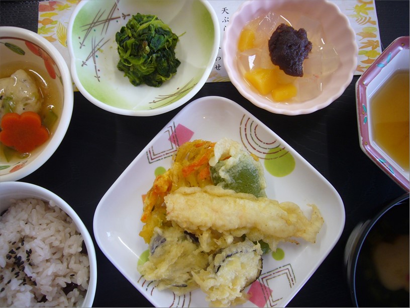「お赤飯」「天ぷら盛合せ」の他、デザートに「あんみつ」を召し上がっていただきました。