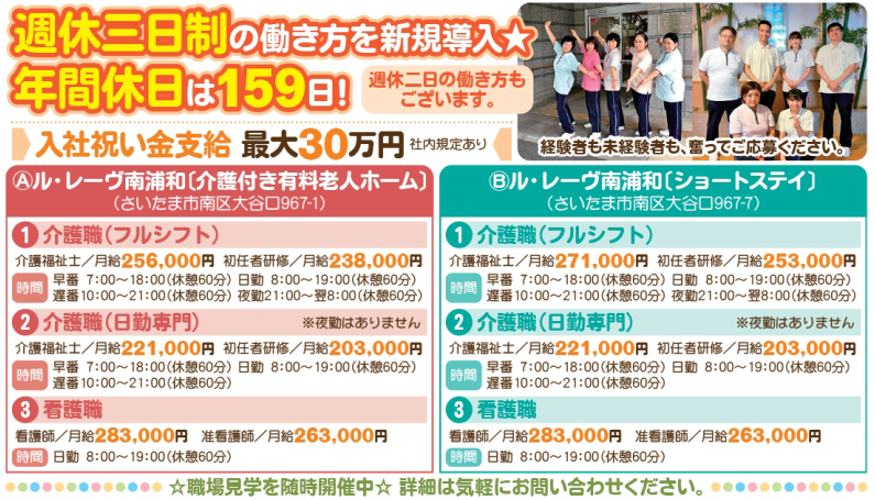 東日本福祉経営サービスグループでは「ル・レーヴ南浦和」「ショートステイ ル・レーヴ南浦和」で週休3日(月休日13日~14日)の働き方が選べるようになりました!
