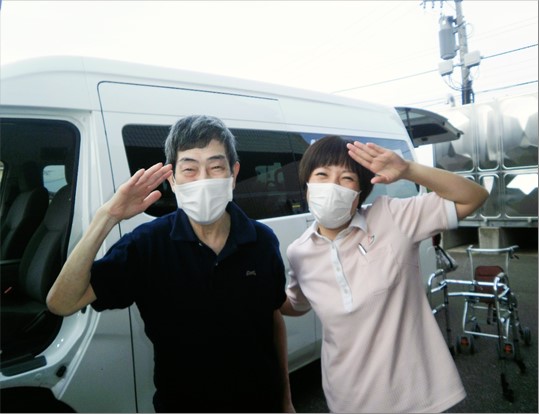 「ただいまぁ、今日も無事に帰って来ました!。」と送迎職員さんとポーズを決めて下さりました。