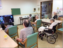 『リーシェ安行』の入居者様も、ご興味のある方々が1階リビングに集合され、パソコンと接続した大型テレビの画面の前で、普段はなかなか味わうことの出来ない歌手の方々の歌声に耳を傾けていらっしゃいました。
