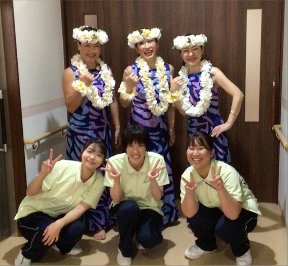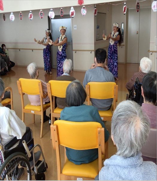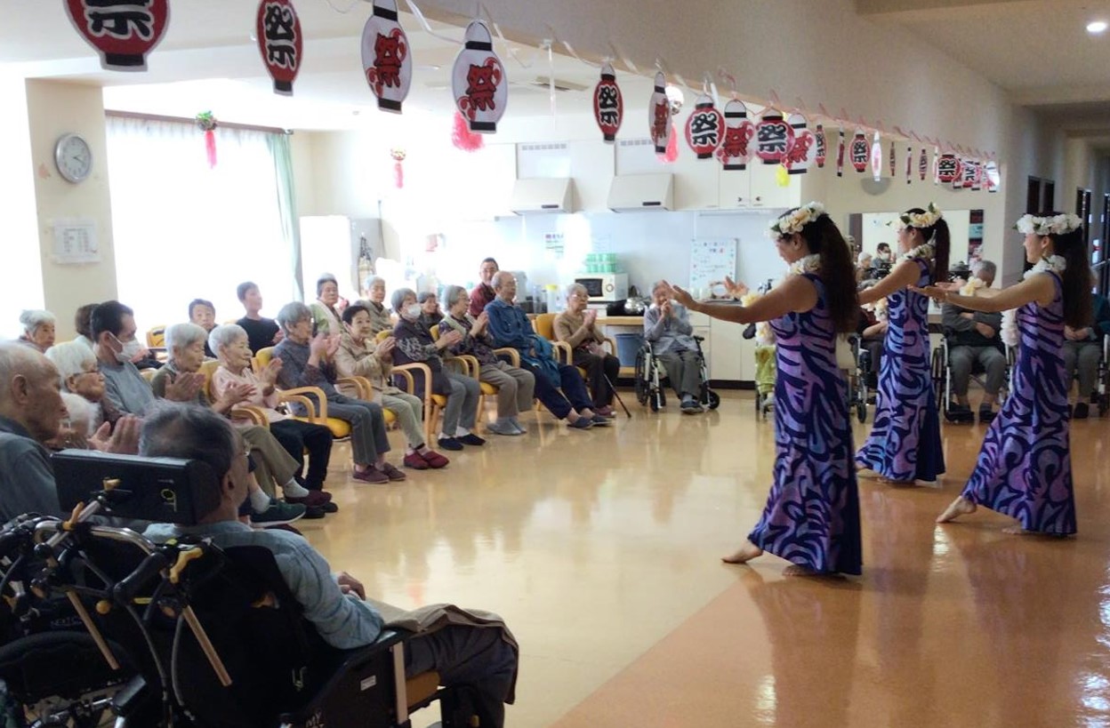 開始前、フロアに集まられるご入居者様からは「フラダンスってどんなのだっけ?」「ハワイかなんかで見る踊りよね」といったお声も聞かれておりましたが、いざショーが始まると皆さま食い入るようにご覧になられ、とても素晴らしかったと大好評でした。