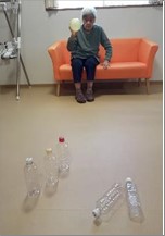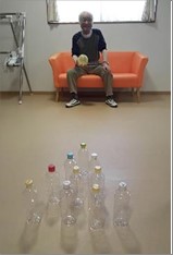 柔らかいボールを投げたり転がしたり、ピンに見立てたペットボトルを倒すボーリング。