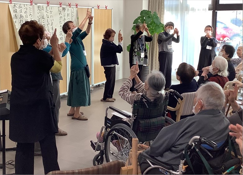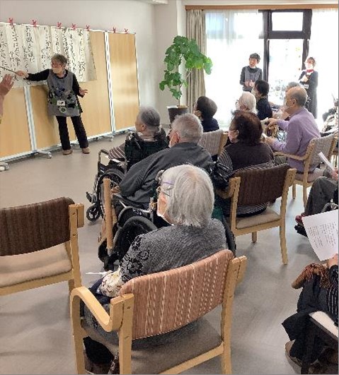 40分ほどのプログラムでおひらきになりましたが、入居者様からは楽しかった、歌詞カードが大きかったので歌詞がわからなくなる心配をしなくてよかった、隣でボランティアさんが一緒に歌ってくれたので歌いやすかった、久しぶりに大人数で集まれてうれしかったという感想を頂戴しました。