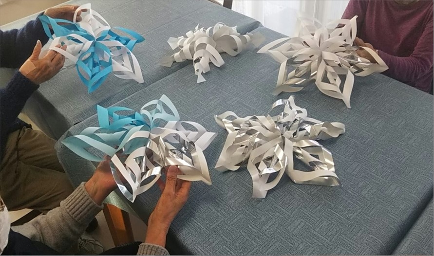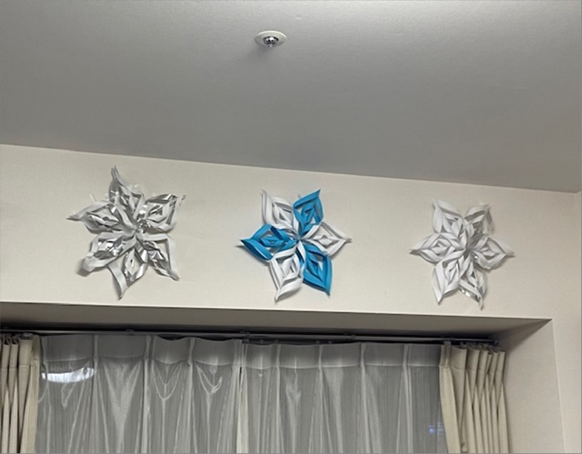 パーツを貼り合わせ、雪の結晶をイメージした素敵な飾りを作りました。