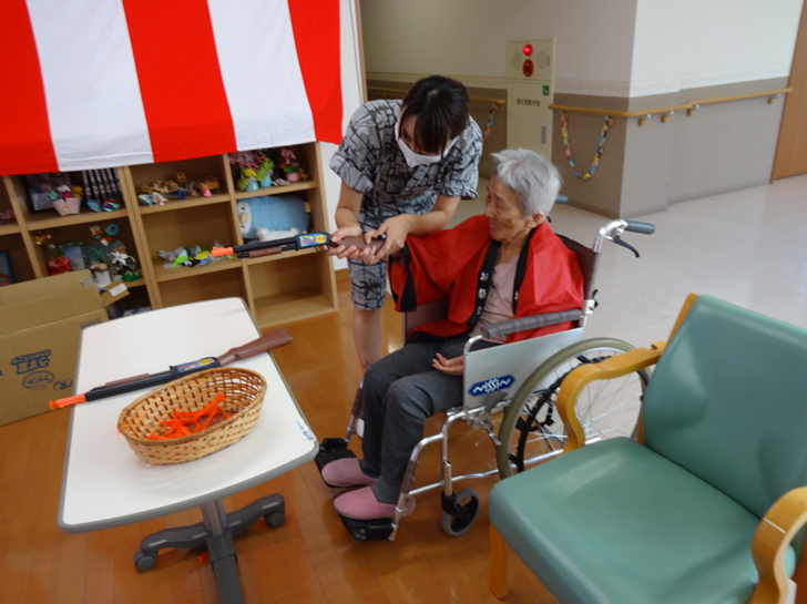 出し物は、「射的」や「輪投げ」、「水ヨーヨー釣り」や「スイカ割り」などの催し物を準備し、皆様に童心に帰って頂けるようなゲームを堪能して頂きました。