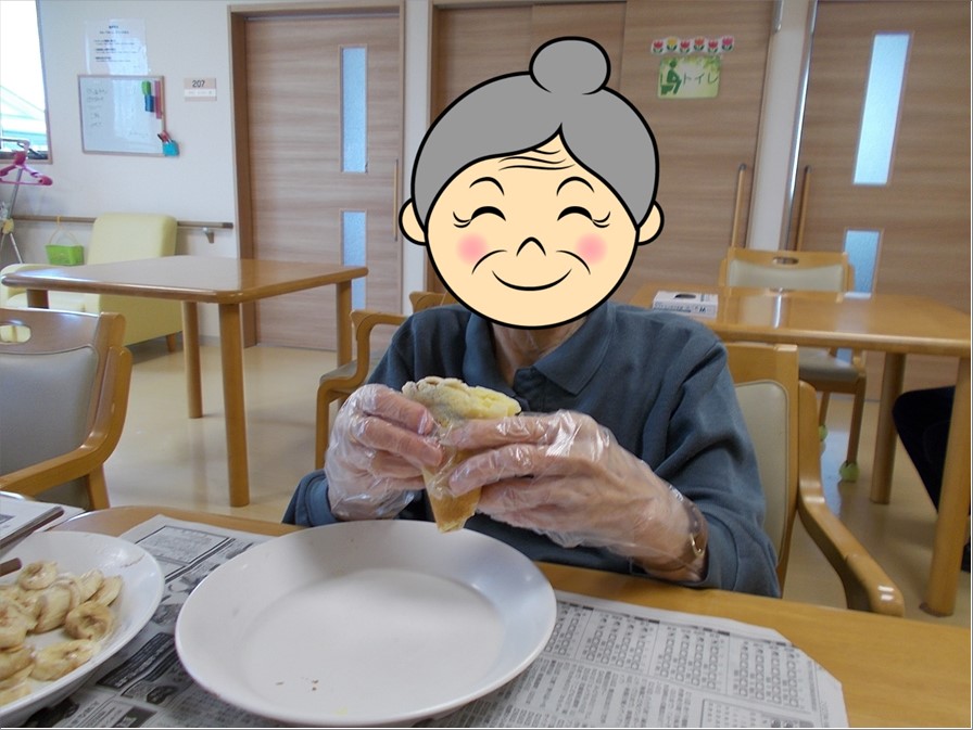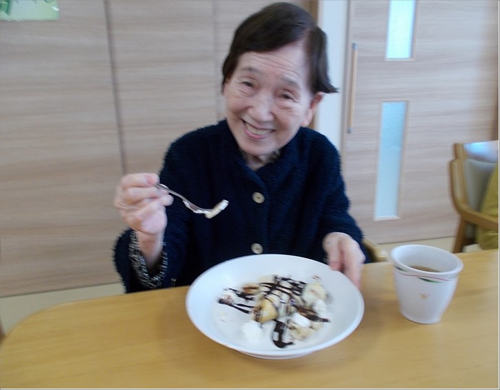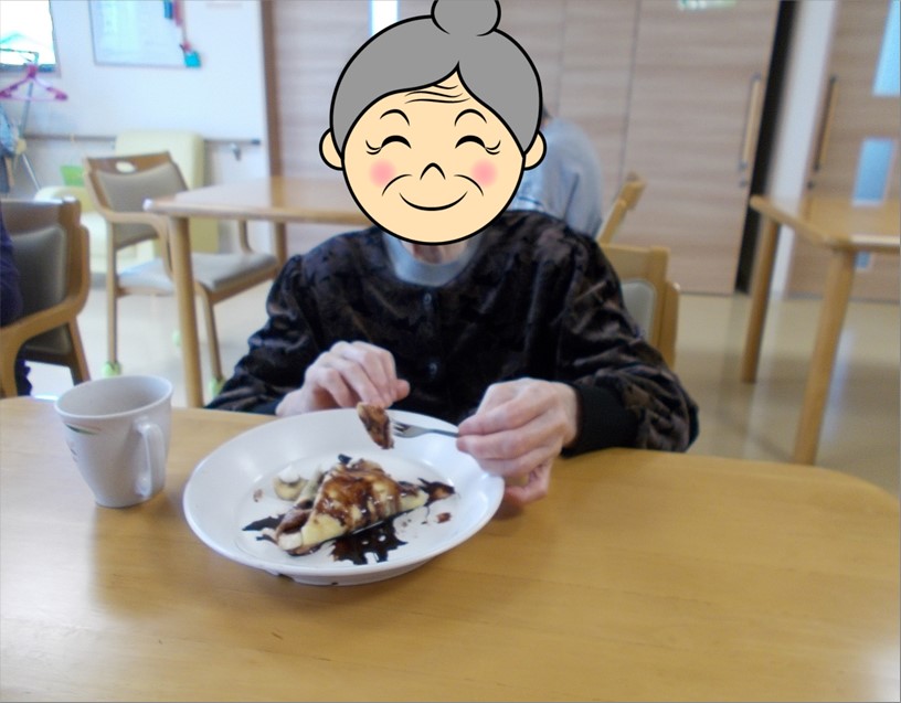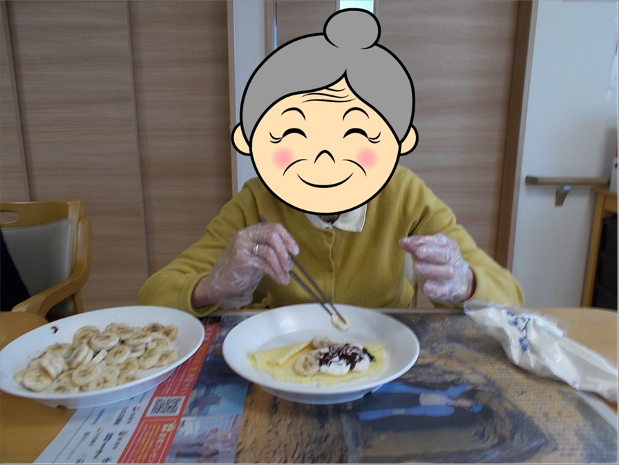 クレープ生地の攪拌からご入居者様にお手伝い頂き、生地が焼き上がった後に、ご入居者様方には思い思いにバナナ・チョコレートソース・ホイップクリームのデコレーションを楽しんでいただきました。