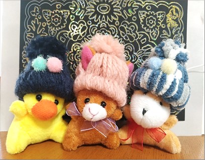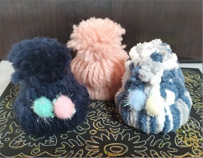 とても可愛いものが完成しました♪ 今回は、それぞれ同色の毛糸を使って製作しましたが、完成したものをみると色や太さを組み合わせることで様々な変化が楽しめそうですね。