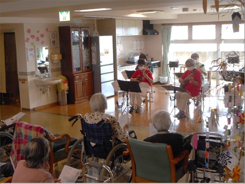 ご入居様のご家族様が活動していらっしゃるウクレレの演奏グループ【ゴパン】の方々が訪問してくださいました🎸