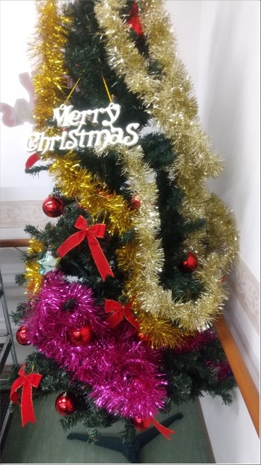 事前に飾りつけを皆様にお手伝いしていただき、クリスマスツリーをフロアーに設置いたしました。