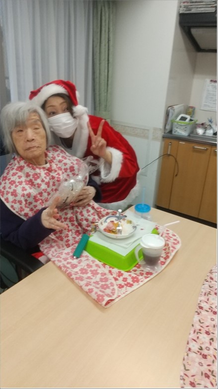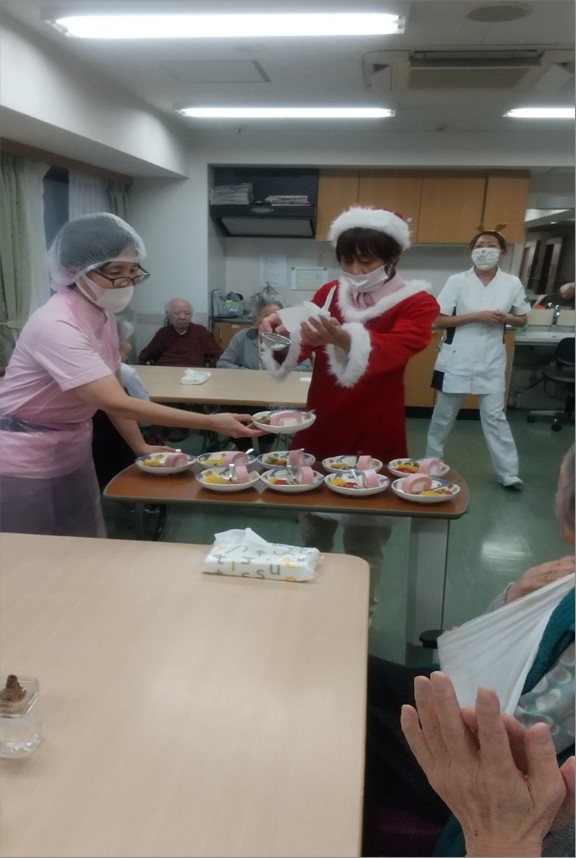 Xmasといえば、雪です。職員によりケーキに粉雪を降らせました。