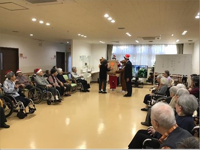 今年のプログラムは①全員で『赤鼻のトナカイ』を大合唱。②職員での鼓笛隊演奏。③職員によるハンドベル演奏。④全員で体操⑤サンタからのプレゼント贈呈。