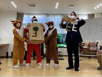 プレゼントの鍵の形をご入居者様へ問題を出し、鍵穴と同じ鍵を選んで頂き無事に開封。