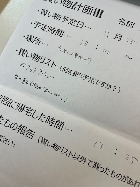 施設に戻ってからは手洗いうがいをし、予定外に買ってしまった物を再度計画書に記載もしてもらいます。