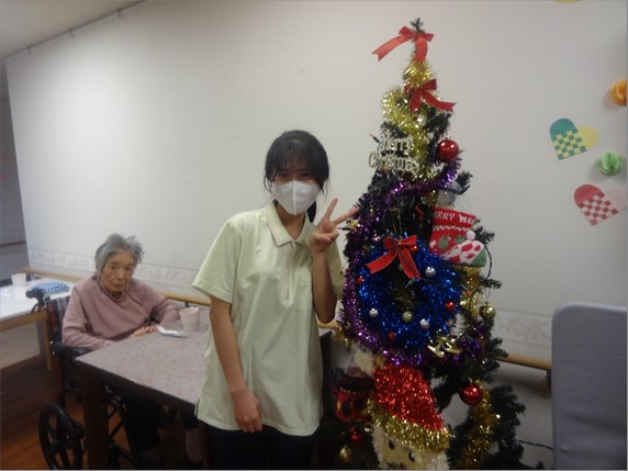 次は高さ180cmのクリスマスツリーの飾りつけを皆さんで行いました。技能実習生もニッコリです。